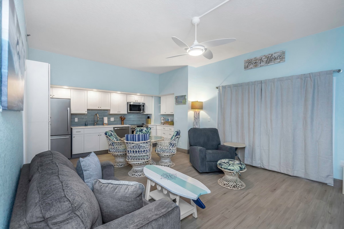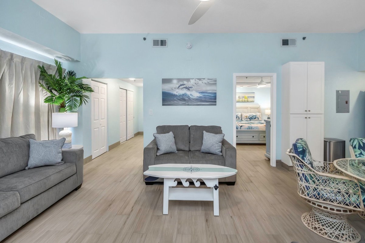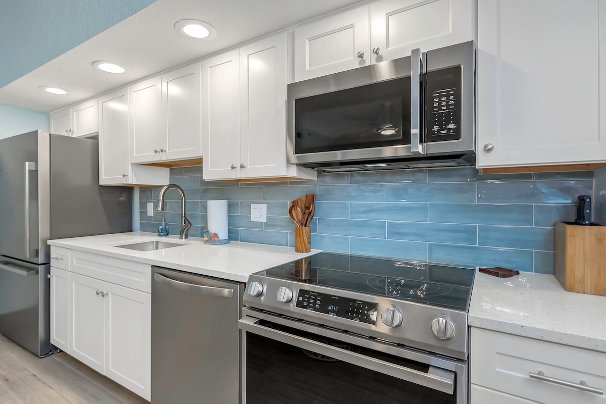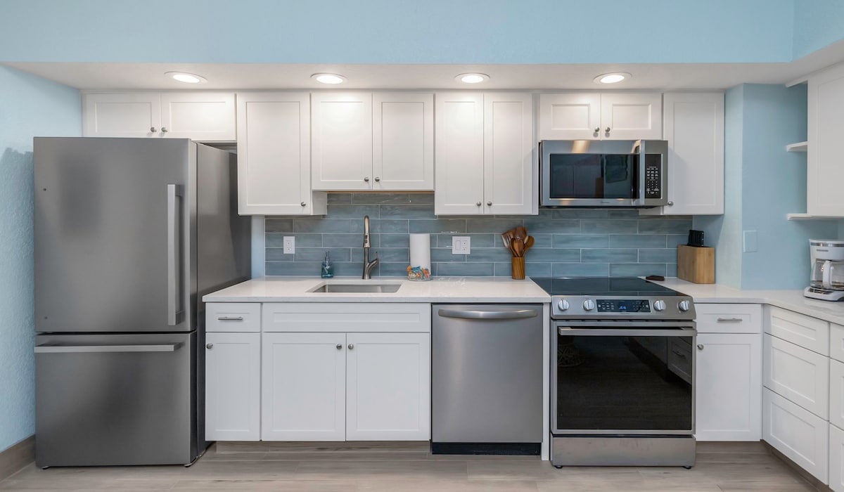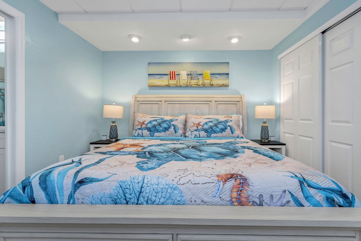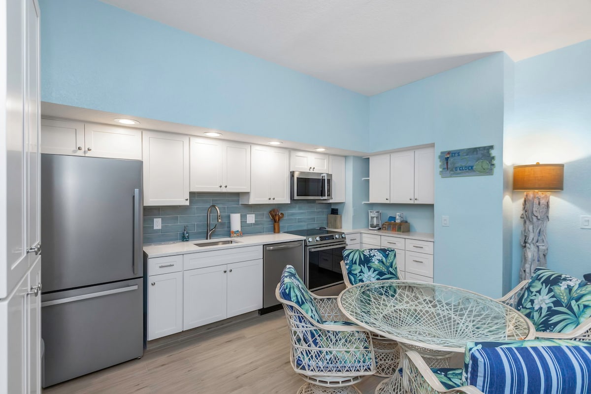 Inside, you'll find a spacious layout with a king-sized bed in the primary bedroom and a sleeper sofa in the living room, making it ideal for couples, small families, or a group of friends (sleeps 4 total). The fully stocked kitchen includes everything you need to cook at home—pots, pans, utensils, blender, coffee maker, and more.
