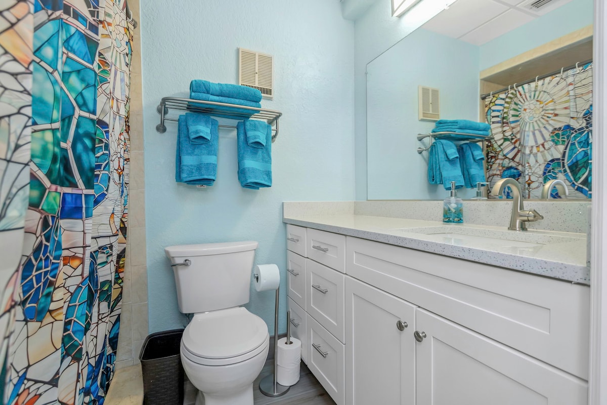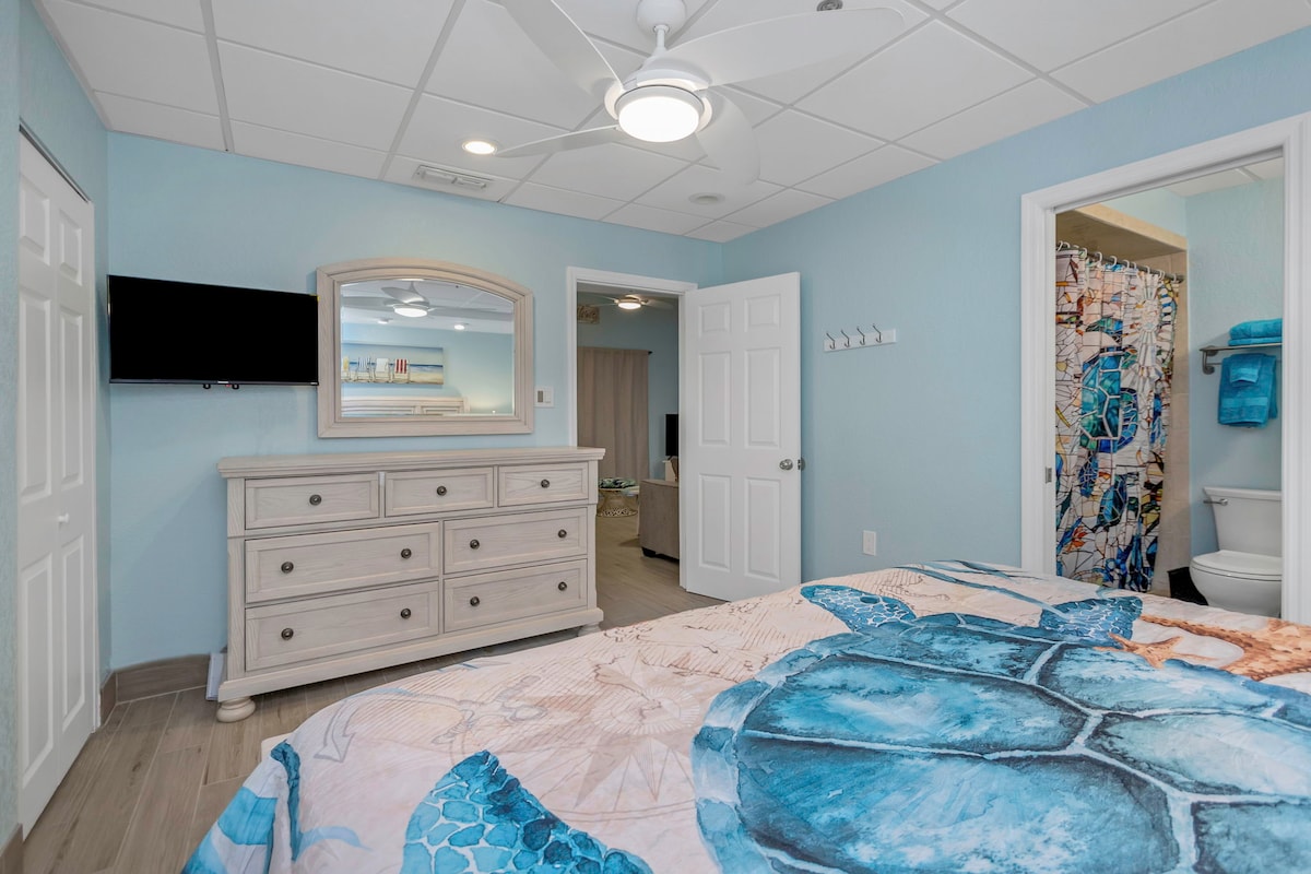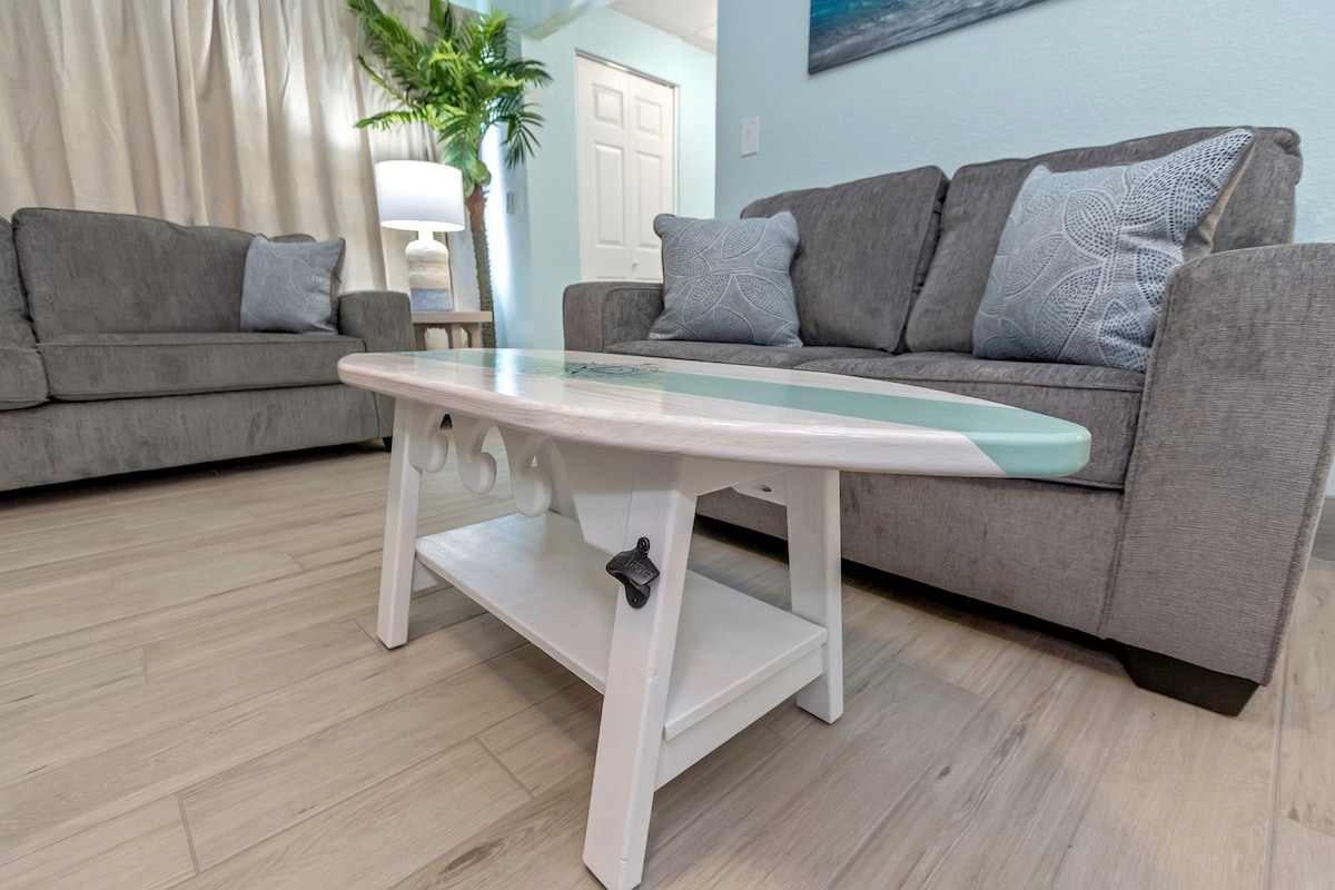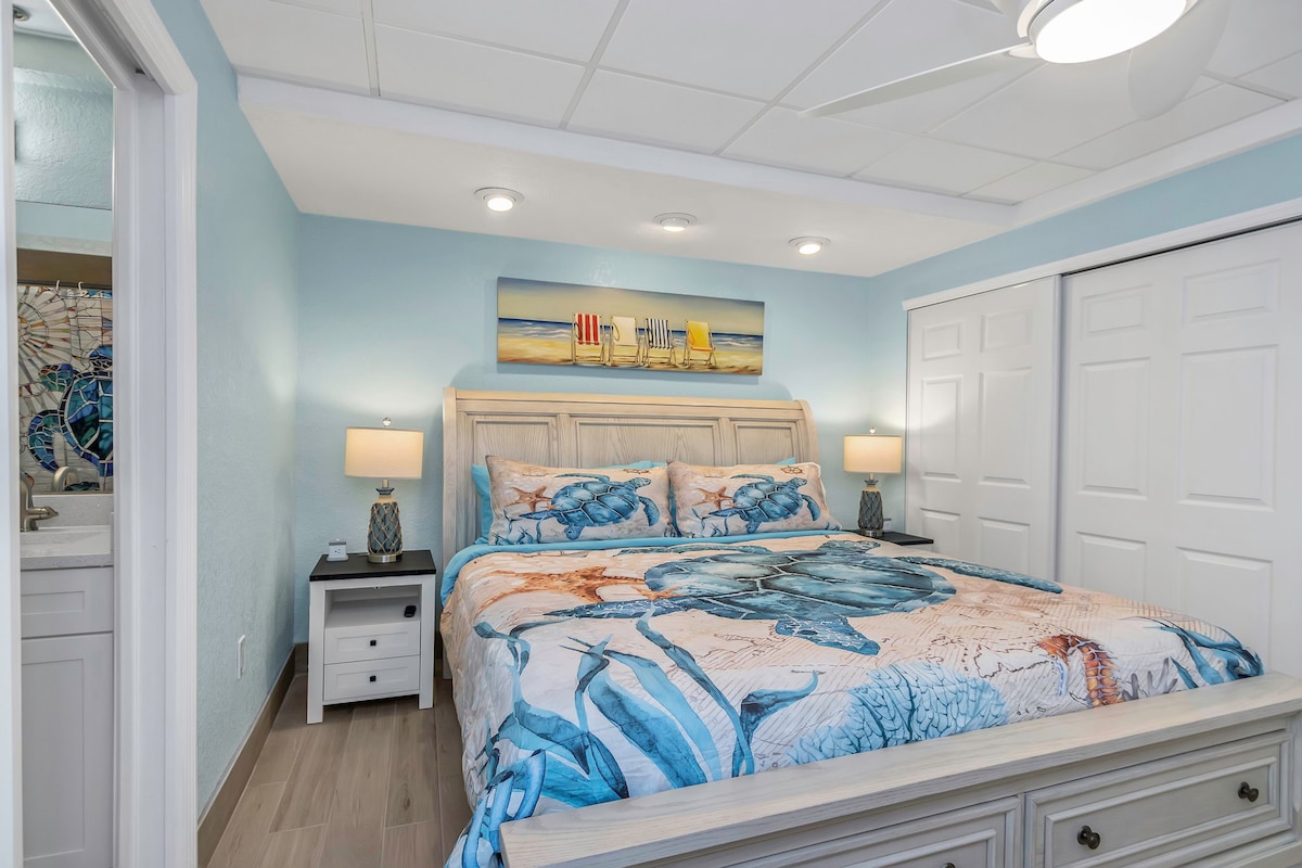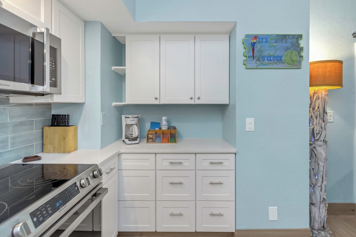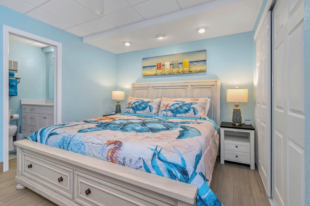 Inside, you'll find a spacious layout with a king-sized bed in the primary bedroom and a sleeper sofa in the living room, making it ideal for couples, small families, or a group of friends (sleeps 4 total). The fully stocked kitchen includes everything you need to cook at home—pots, pans, utensils, blender, coffee maker, and more.